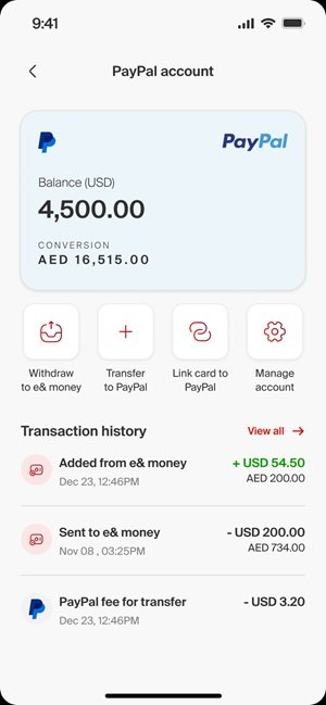 ستوفر الشراكة وصولاً فورياً لمستخدمي “PayPal“، حيث سيمكنهم تحويل الأموال خلال لحظات وعلى مدار الساعة، لتكون جاهزة للاستخدام في دفع الفواتير أو التحويلات من شخص لآخر أو للسحوبات النقدية من الرصيد أو عبر استخدام الرصيد ضمن بطاقة ” e& money“. سيتم أيضاً تثبيت أسعار الصرف مسبقاً، مع الإفصاح عن الرسوم بشكل كامل لضمان الشفافية وتجنب الرسوم غير المتوقعة الشائعة في قنوات التحويل التقليدية.