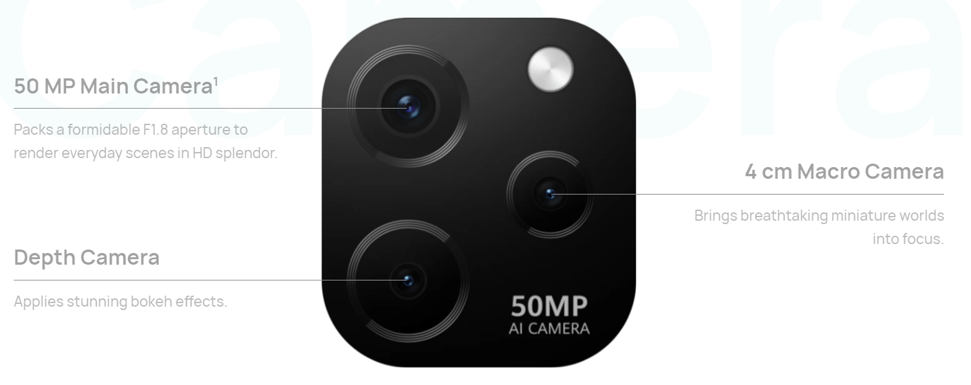 تعمل كاميرا العمق بدقة 2 ميجابكسل جنبًا إلى جنب مع الكاميرا الرئيسية بدقة 50 ميجابكسل لإنتاج صور فوتوغرافية ذات إضاءة جيدة تبرز الهدف ومميزاته بتفاصيل واضحة. أخيرًا، تتيح كاميرا الماكرو الثالثة للمستخدمين التقاط الأشياء التي تبعد 4 سم عن العدسة لأخذ صور عن قرب بمستوى تفاصيل لا يُصدق.