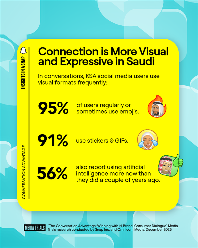 وتظهر النتائج وجود تحول واضح في سلوك المستهلكين، إذ لم يعد التواصل يقتصر على الوسائل النصية، بل بات يشمل أيضاً الصور ومقاطع الفيديو والتواصل التعبيري المدعوم بالذكاء الاصطناعي. وفي المملكة العربية السعودية، أصبحت منصات مثل سناب شات أداة محورية لتحديد كيفية تواصل الناس والتعبير عن أنفسهم والتفاعل مع العلامات التجارية بطرق أكثر عمقاً وذات طابع شخصي.